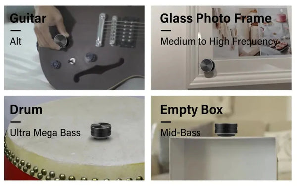 Place it on wood, glass, or metal and let bone conduction technology amplify your audio — turning any surface into a dynamic sound system.